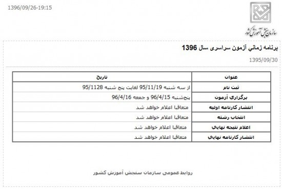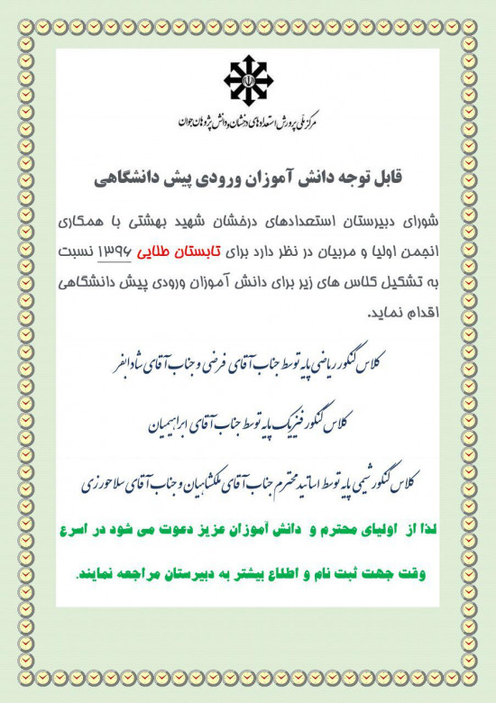 مطابق اعلام مرکز ملّی پرورش استعداهای درخشان و دانش‌پژوهان جوان، آزمون ورودی پایۀ هفتم دبیرستان­های استعدادهای درخشان در ساعت 9:00 صبح روز پنج‌شنبه 1396/02/14 و آزمون ورودی پایۀ دهم دبیرستان‌های استعدادهای درخشان رأس ساعت 9:00  صبح روز جمعه 1396/02/15 در سراسر کشور به‌صورت هم‌زمان برگزار خواهد شد. لازم به ذکر است، آزمون ورودی دبیرستان‌های استعدادهای درخشان، ویژۀ دانش‌آموزان مدارس ایرانی خارج از کشور، در تاریخ‌های ذکرشدۀ فوق و در ساعتی که در اطّلاعیۀ مرکز امور بین‌الملل و مدارس خارج از کشور اعلام خواهد شد، برگزار می‌شود. ضمناً، تمامی مراحل اعمّ از ثبت‌نام، صدور کارت ورود به جلسه، اعلام نتیجۀ آزمون، ثبت اعتراضات و پاسخ‌گویی به آنها، به صورت اینترنتی است. در نتیجه، همۀ مراحل به شیوۀ غیرحضوری توسّط داوطلبان انجام می‌شود و مدارس محلّ تحصیل داوطلبان، در این خصوص مسئولیّتی ندارند. ‌‌